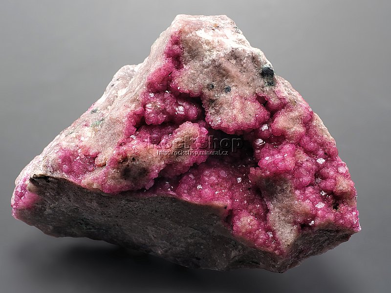 Bohatá ukázka opravdu sytě růžových krystalů kobaltokalcitu na křemencové podložce. |